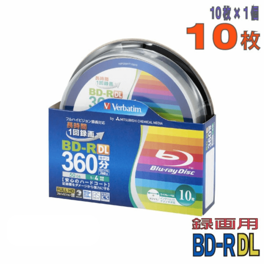 【商品仕様概要】Verbatim(バーベイタム) 1回録画用 BD-R DL / 型番:VBR260YP10V1 / 10枚スリムケース / 50GB(片面2層) / 1-4倍速 / 地デジ360分・BS260分 / ワイドホワイトレーベル(インクジェット対応) / 原産国:台湾