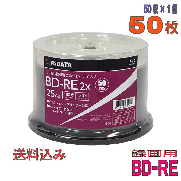 【商品仕様概要】RIDATA(ライデータ) くり返し録画用 BD-RE / 型番:BE130EPW2X.50SP A / 50枚スピンドル / 25GB(片面1層) / 1~2倍速 / 地デジ180分・BS130分 / ワイドホワイトレーベル(インクジェット対応) / 原産国:ベトナム(記録面:台湾RITEK製造) / 1年保証付き / 送料込み